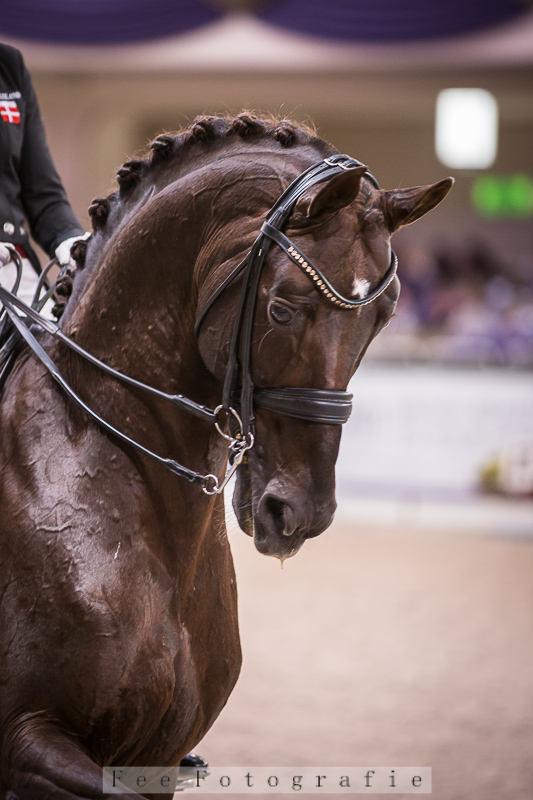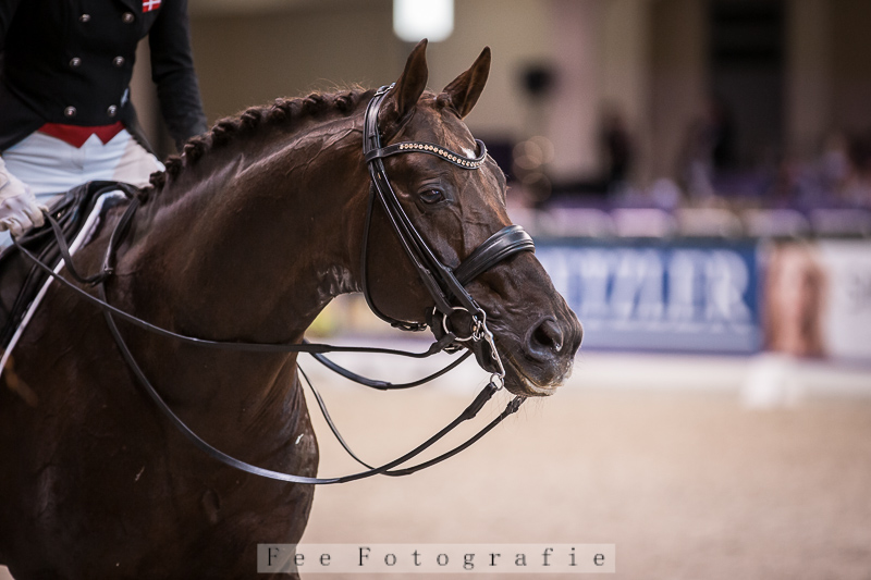 Sturmhohen is an elegant, dark chestnut colored stallion with eye-capturing movement that made us just go "we have to have him". Sturmhohen, or 'Stormy', as he is called in the stable, was bought from Teller Dressage when he was seven years old and trained up to Intermediare I. We decided to start him in PSG to get to know him an build that trust in order to take him all the way to Grand Prix.