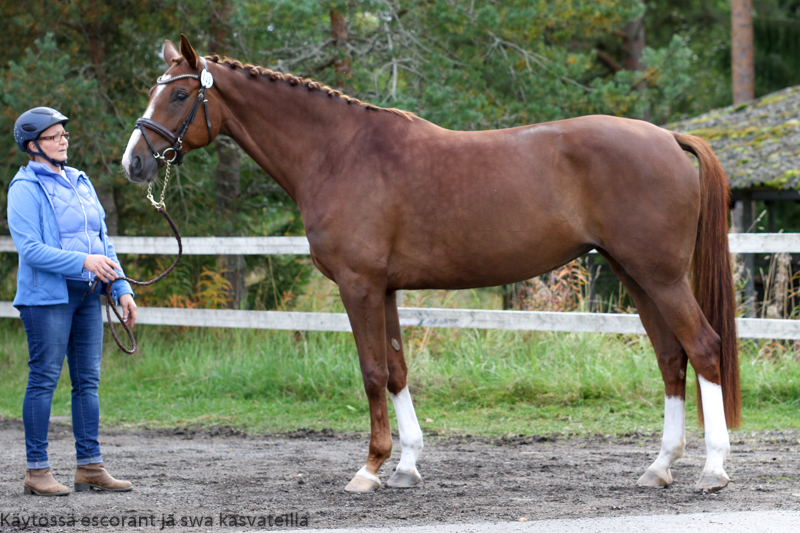 Leonie is a pretty mare with expressive eyes and good gaits. Especially her canter is very active with good distance gain and adaptability to both outdoor and indoor courses. Leonie has precise and careful jumping technique, which combined with her canter and courage makes her a good partner in the ring. She is very cooperative and positive persona, sometimes a bit too eager and needs some holding back in order to keep the tempo when on the course. Outside the ring she is a bit goofy and very social, but gentle, and likes to spend time with both people and other horses.
