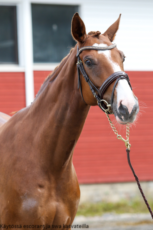 Leonie is a pretty mare with expressive eyes and good gaits. Especially her canter is very active with good distance gain and adaptability to both outdoor and indoor courses. Leonie has precise and careful jumping technique, which combined with her canter and courage makes her a good partner in the ring. She is very cooperative and positive persona, sometimes a bit too eager and needs some holding back in order to keep the tempo when on the course. Outside the ring she is a bit goofy and very social, but gentle, and likes to spend time with both people and other horses.